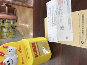 Rのカウンターに置いてある募金箱